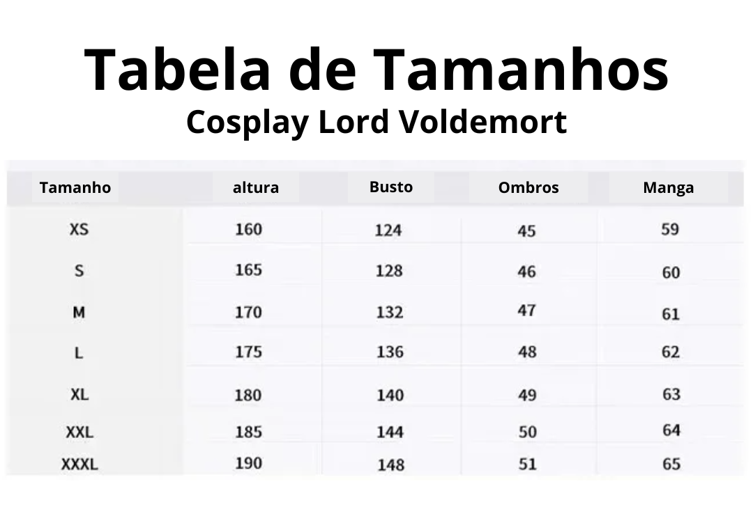 Escolha por favor um tamanho apropriado baseado na altura, na circunferência do peito, no comprimento do ombro, e no comprimento da luva. Por favor, verifique a tabela do tamanho para a referência correta e desfrutar de sua festa role-playing vestindo este traje Voldemort.
